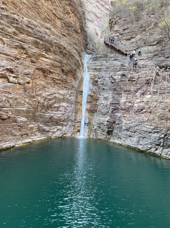 經(jīng)過一晚上的休息,第二天早上大家精神抖擻的趕到桃花谷景區(qū)。它是以山、谷、潭、洞為主的自然景區(qū)。因其“三九嚴(yán)寒桃花開,三伏酷暑水結(jié)冰和346米高亞洲高瀑布”而聞名于世。在往景區(qū)深處,隨著指引來到太行天路景區(qū)。太行天路景區(qū)位于太行山之巔,北起桃花谷景區(qū),南至仙霞谷景區(qū),全長約30km,既是景區(qū)環(huán)線游覽道路的重要組成部分,更是俯瞰太行山壯美風(fēng)光的好位置。乘坐觀光車游走于太行天路,深邃的峽谷、直立的巖壁,帶給我們強(qiáng)烈的視覺震懾。